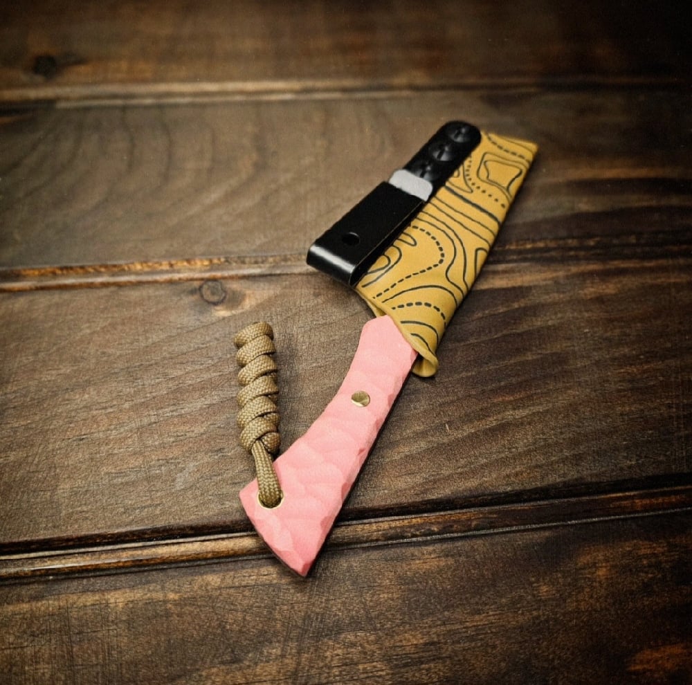 • 1/8" 80crv2 HCS with a gun blue finish • The handle is constructed of pink G10 & brass pins • Approx. 6.25" OAL with 2.5" cutting edge • Comes with kydex sheath shown